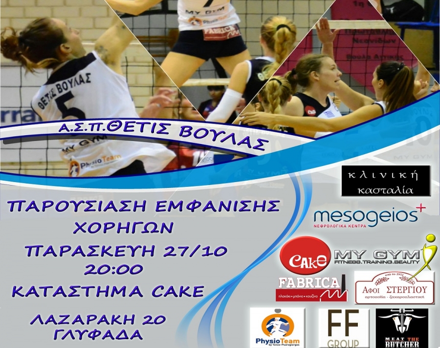 Την Παρασκευή 27 Οκτωβρίου στις 20:00, η Θέτις Βούλας θα πραγματοποιήσει ειδική εκδήλωση παρουσίασης της εμφάνισης του Γυναικείου τμήματος για την σεζόν 2017-2018 και των χορηγών της, στο κατάστημα Cake Γλυφάδας (Λαζαράκη 20).