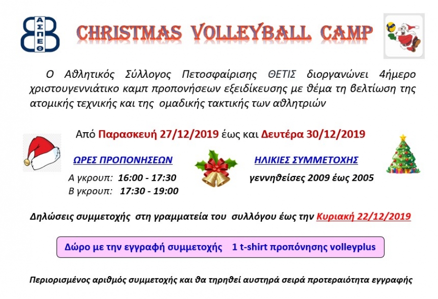 Ο Α.Σ.Π. Θέτις Βούλας διοργανώνει 4ημερο Χριστουγεννιάτικο Camp προπονήσεων - εξειδίκευσης (27-30/12) με θέμα την βελτίωση της ατομικής τεχνικής και της ομαδικής τακτικής των αθλητριών.