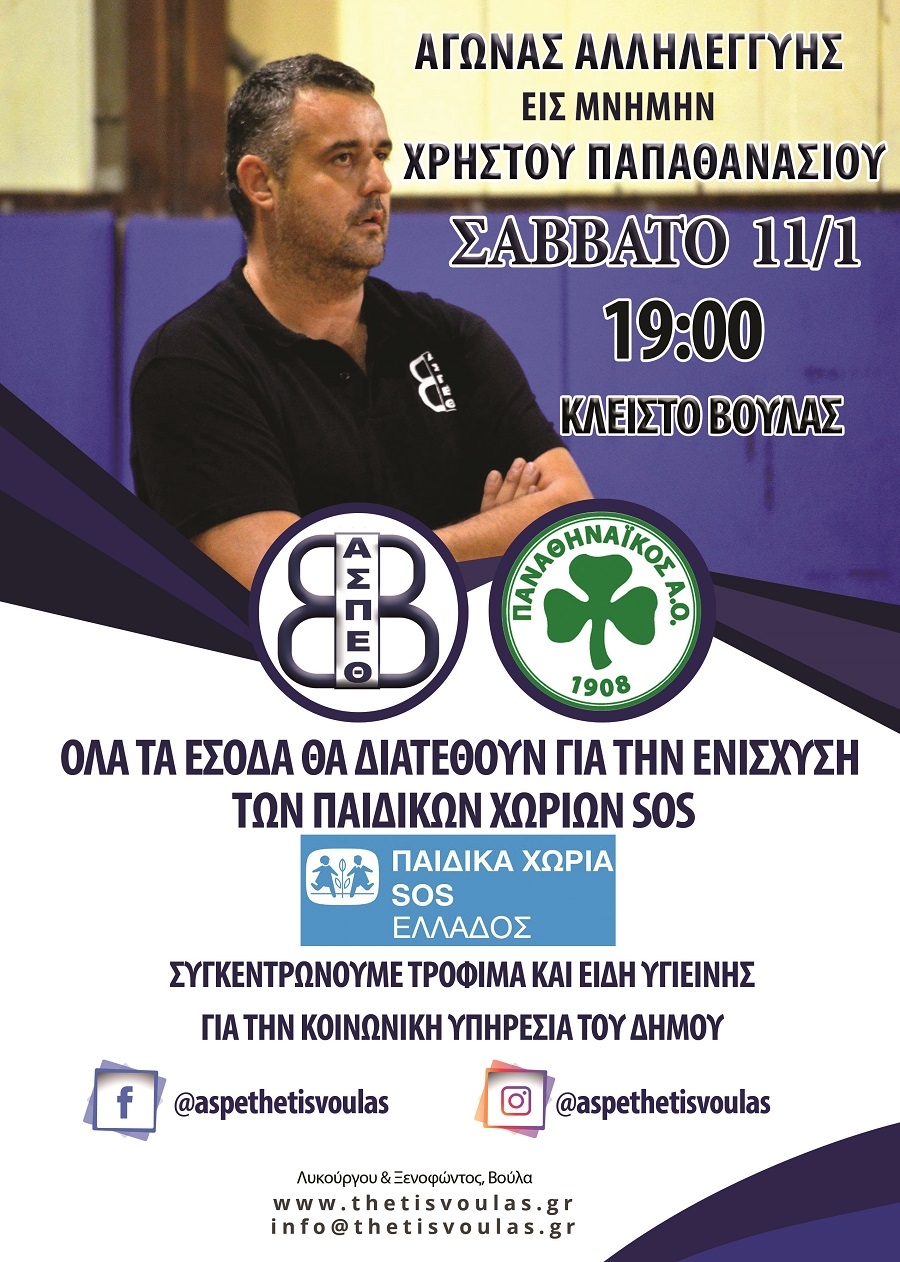 Ο Α.Σ.Π. Θέτις Βούλας θέλοντας να τιμήσει τη μνήμη του προπονητή μας Χρήστου Παπαθανασίου που έφυγε από κοντά μας πριν από τέσσερα χρόνια, διοργανώνει το Σάββατο (11/1,19:00 -ώρα προσέλευσης 18:30) στο Κλειστό Γ.Γεννηματάς της Βούλας, αγώνα αλληλεγγύης, μεταξύ των ομάδων γυναικών της Θέτιδας Βούλας και του Παναθηναϊκού.