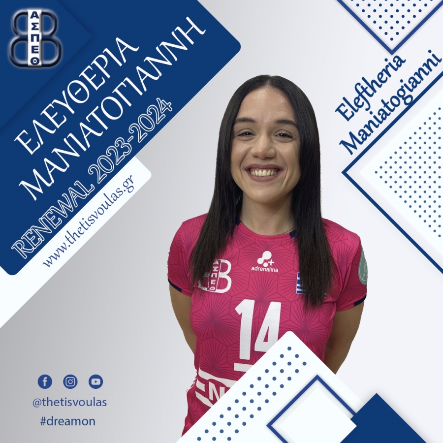 Ο Α.Σ.Π. Θέτις Βούλας ανακοινώνει με χαρά πως η αρχηγός και ψυχή της ομάδας των Γυναικών Ελευθερία Μανιατογιάννη θα συνεχίσει να αγωνίζεται με τα χρώματα της ομάδας μας και για την σεζόν 2023-2024.