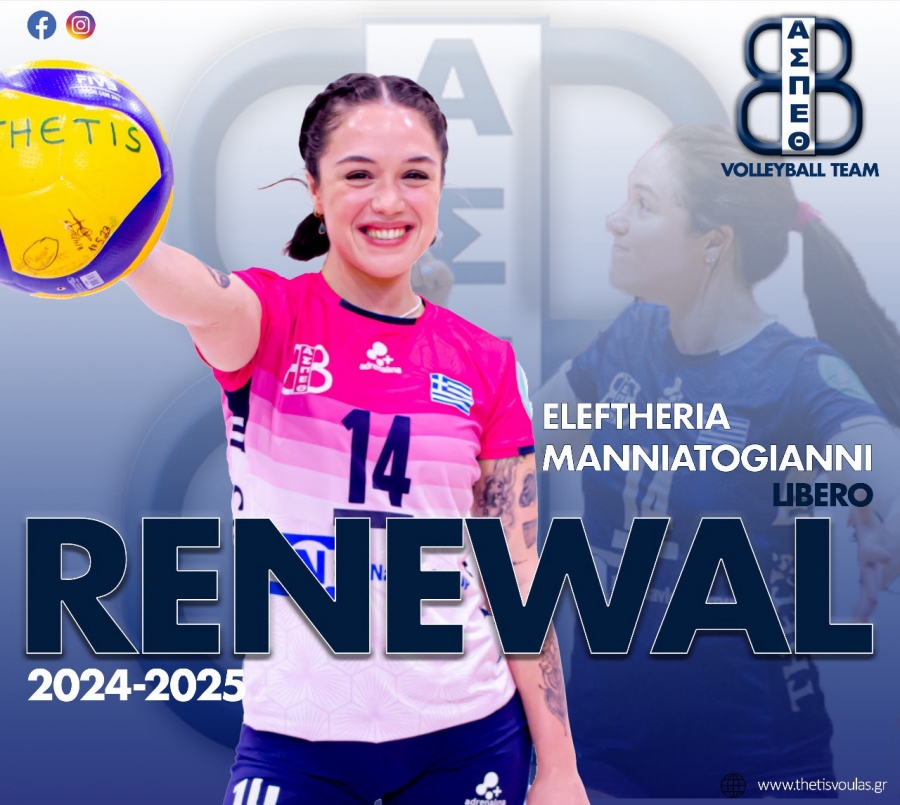 Ο Α.Σ.Π. Θέτις Βούλας ανακοινώνει με χαρά την ανανέωση της συνεργασίας του για τρίτη διαδοχική σεζόν, με την αρχηγό της ομάδας των Γυναικών Ελευθερία Μανιατογιάννη.